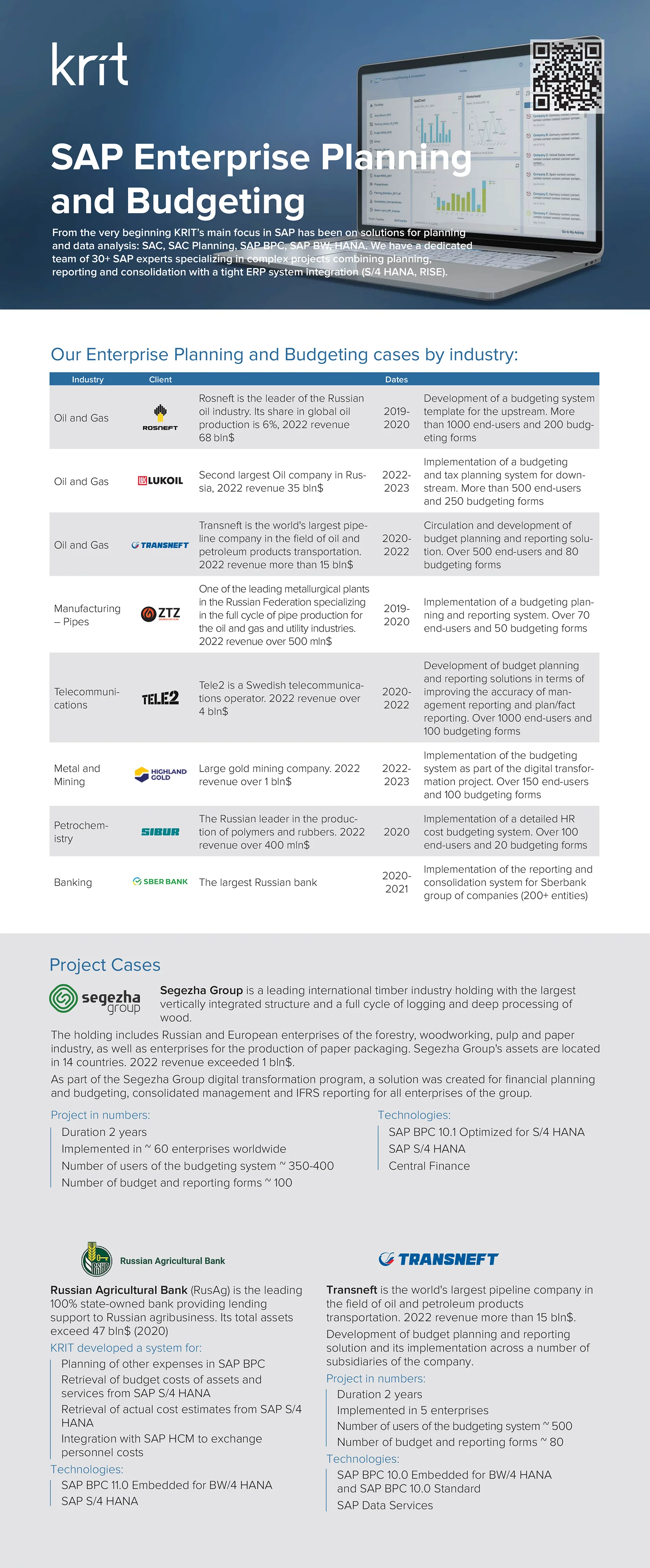 From the very beginning KRIT’s main focus in SAP has been on solutions for planning and data analysis: SAC, SAC Planning, SAP BPC, SAP BW, HANA. We have a dedicated team of 30+ SAP experts specializing in complex projects combining planning, reporting and consolidation with a tight ERP system integration (S/4 HANA, RISE).